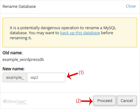 3. Under Current Databases, you can see a list of all your databases. Locate the Database and then click on Rename.